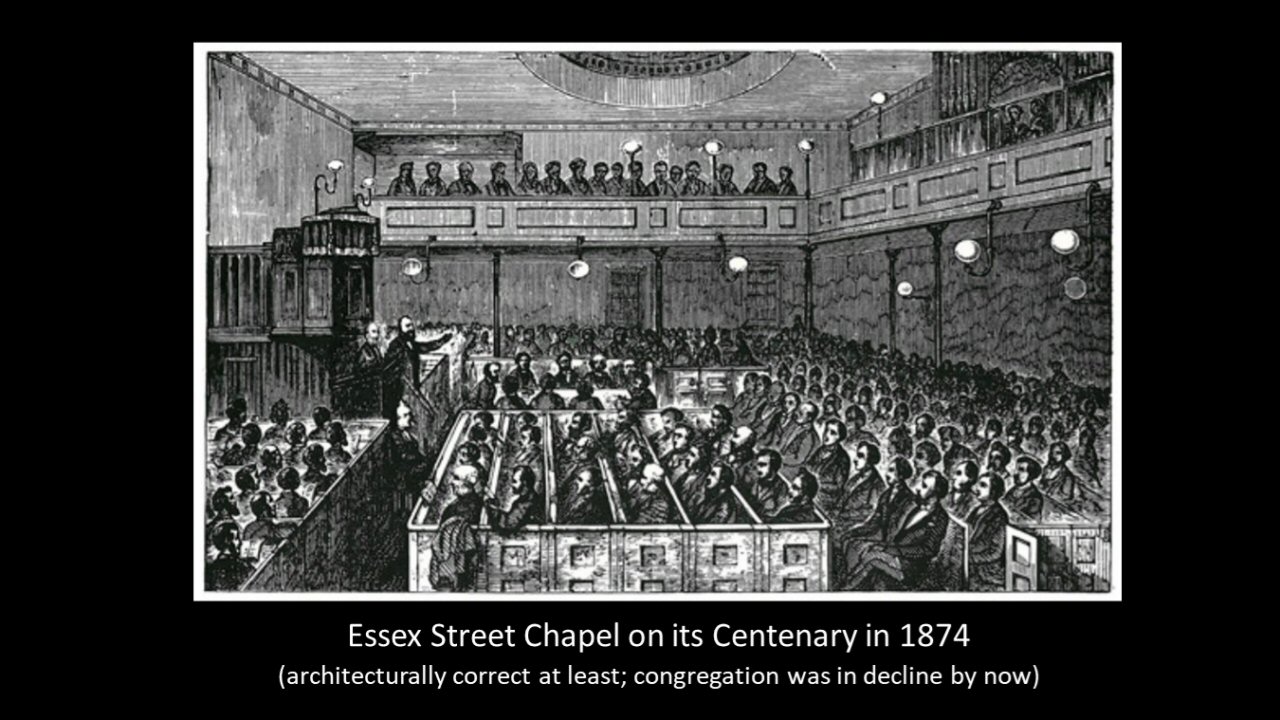This is approximately what it would have looked like (though this picture is of a later event). There were 200 people at that first gathering, including Benjamin Franklin, Joseph Priestley, and a number of other big political and legal names of the time, even though at this point openly anti-Trinitarian preaching was still technically against the law. Supposedly government agents were present to keep an eye on things but the press generally reported sympathetically. Theophilus Lindsey’s well-off supporters chipped in to buy the freehold of Essex House and a chapel – the Essex Street Chapel – was built on the site and flourished for the next half century. However, over time, the demographics of the city changed, and people moved to the suburbs. By the 1880s the congregation was in decline and they were thinking about closing altogether.