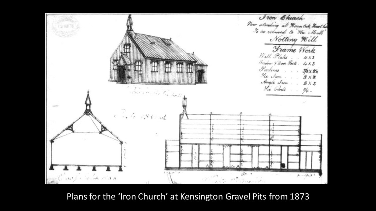 James Clark Lawrence, later Lord Mayor of London, bought some land in what was known as the Kensington Gravel Pits and a temporary ‘Iron Church’ made of corrugated iron was put up. By the 1880s the congregation was well on the way to raising funds for a new, larger church. And – this is where the two strands of our story join together – this is the point where Lindsey’s original Essex Street Chapel was shrinking due to the population moving out of central London. So to cut a long story short, the two congregations decided to merge on the Kensington site, which hastened the move to demolish the old Iron Church and build a fancy new gothic building.