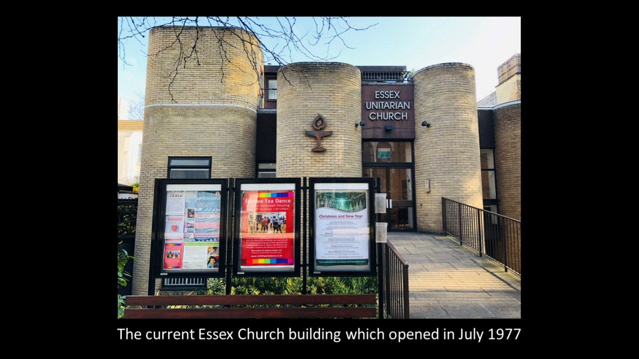 And from this point the congregation became known as ‘Essex Chapel’, later ‘Essex Church’, as a way to assert continuity with the first Unitarian congregation that Lindsey had started. Only bits and pieces of records from this time have survived but in his book telling the history of our congregation Raymond Williams looks back to the 1880s, and makes a significant comment: ‘it appears that most lived within walking distance of the church… but it is equally evident that, even in those years, many left the district after a few years, and the area was even then assuming its modern character as a dormitory for birds of passage.’ Not many of us live in walking distance any more but I was surprised to hear that even ~150 years ago the turnover of people was high. Still, they expanded their activities in the early 20th century, and had a huge Sunday school, but after the war the numbers started to decline again, and the building started to show its age. The church was a bit too big for the congregation so they decided to demolish and redevelop in the 1970s. For a few years the congregation met in hired rooms again. The theological centre of gravity started to shift – not quite so Christian-centred – gradually more humanist influences.