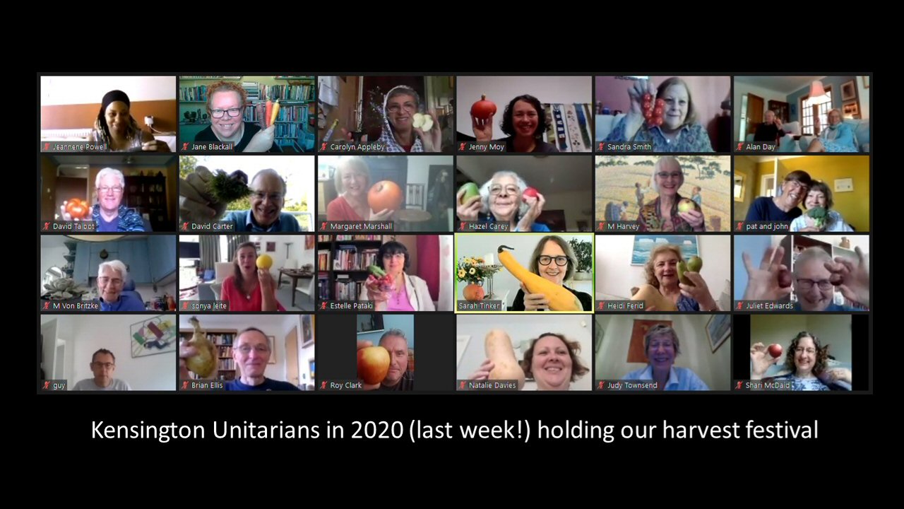 So I really wanted to include one more slide. To affirm that even while we’re not meeting in our beloved building we’re still in continuity with that first congregation from Essex Street, and the Iron Church, the Gothic Church, and the rented rooms. This is part of the same story. Us mucking about with our comedy vegetables on Zoom last week for our virtual harvest festival.